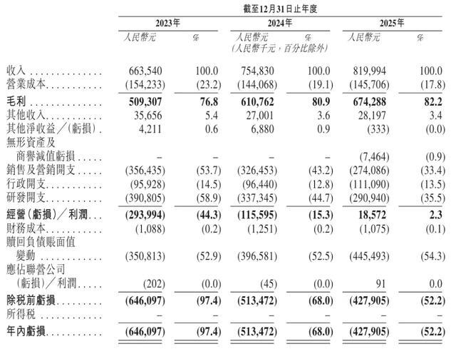 群核科技2023年、2024年、2025年运营利润分别为-2.93亿、-1.16亿、1857万元;运营利润率分别为-44.3%、-15.3%、2.3%;群核科技2023年、2024年、2025年年内亏损分别为6.46亿、5.13亿、4.28亿元,其中,2025年计入了赎回负债账面值变动4.45亿元。