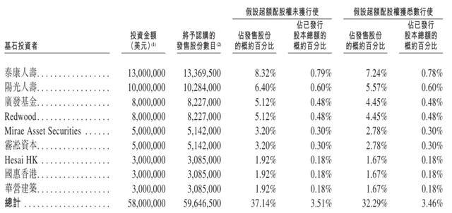 群核科技基石投资者分别为泰康人寿、阳光人寿、广发基金、弘毅投资旗下Redwood、Mirae Asset Securities、雾凇资本、Hesai HK (禾赛科技)、国惠香港、华营建筑,一共认购5800万美元(约4.54亿港元)。